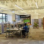 As patrons enter, computers for adults greet them in the main space. An area dedicated to teens is off to the right. A children’s area, including a “Discovery Center,” lines the back wall. A space for adults is in the rear. A large program room, which can be divided into two, fills out the other side.