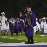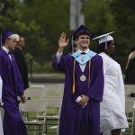 George Makhoul waves to family and friends as he finds his seat at the start of Baldwin High School’s graduation ceremony.