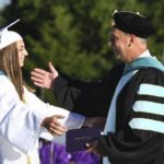 Graduating senior Jenna Lutz moves in to hug her father, district Superintendent Dr. Randal Lutz, as she receives her diploma during one of three commencement ceremonies at Baldwin High School on Wednesday, July 1, 2020.