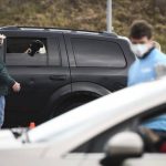 A dog peeks out the back window of an SUV during a drive-through food distribution hosted by South Hills Interfaith Movement in partnership with the Greater Pittsburgh Community Food Bank at Bethel Park High School on Saturday, Dec. 12, 2020. The distribution had enough food to feed 1,000 families. Each vehicle received boxes of non-perishable food as well as meat, dairy items and vegetables.