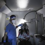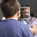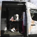 Fifth-grader Elisha Acharya begins an eye exam with optician Nancy Mesko inside a Vision To Learn mobile clinic at J.E. Harrison Education Center on Thursday, March 25, 2021.
