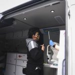 Fifth-grader Elisha Acharya receives an eye exam from optometrist Aaron Harsch inside a Vision To Learn mobile clinic at J.E. Harrison Education Center.