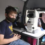 Second-grader Cody Fenlock receives an eye exam from optometrist Aaron Harsch inside a Vision To Learn mobile clinic.