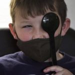 Second-grader Cody Fenlock covers an eye for an eye exam.