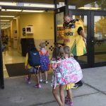 Gill Hall Elementary kindergartner Trey Gratton (in gray) and other students arrive for the first day of school on Aug. 23.