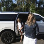 Science teacher Jennifer Gigliotti holds a car door as first-grader Liliana Cirigliano arrives for the first day of school at Gill Hall Elementary in the West Jefferson Hills School District on Aug. 23.