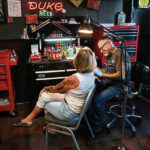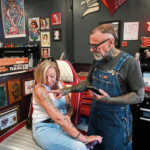 Tattoo artist Duke Miller talks to client Lori Cairns of Greensburg about adding to an existing tattoo inside his Greensburg studio, Old Skool Tattoo Company.