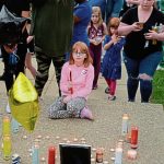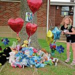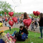 Children laid stuffed animals, toy cars and a few handwritten notes by a tree as others held candles and colored star- and heart-shaped balloons.