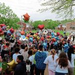 Balloons were released shortly after the prayer. They brought some color to the gray skies, which began to rain just after the last one took flight.