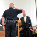 The winner of the first Brian Shaw Memorial Scholarship, Andrew M. Falconer, 22, of Canonsburg, salutes the Shaw family on Friday, June 14, 2019, at the Allegheny County Police Academy graduation ceremony.