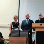 Slain New Kensington police Officer Brian Shaw’s mom Lisa, brother Steffan and father Stephan stand as Brian Shaw Memorial Scholarship Fund President Terry McClain announces that Andrew M. Falconer is the first recipient of the award Friday, June 14, 2019, during the graduation ceremonies of the Allegheny County Police Academy.