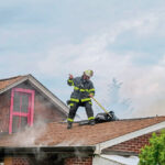 A firefighter works to ventilate the roof at the rear of a home in the 300 block of Logan Avenue in Leechburg.