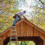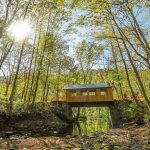The wooden bridge is 35 feet long and made of rough-cut hemlock from Amish country and a green corrugated metal roof.