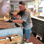 Sam Sheaffer fills a basket of fries in the Del Vecchio’s food truck during the second Fridays on Fifth on Fifth Avenue in New Kensington on Friday, Aug. 27, 2021. Food trucks parked along Fifth Avenue between 9th and 11th Street offered a variety of food and drink for crowds strolling the city’s streets.