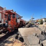 Norfolk Southern Railroad crews ripped out old pavement Monday at its Corbet Street crossing in Tarentum to repair potholes.