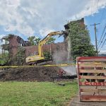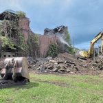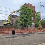 The demolition was being handled privately by the building’s owners, brothers Michael and Theodore Saganis. The contractor, Wayne Grguric Xcavate of Clarksburg, was slowly and carefully taking the building apart with an excavator positioned atop a mound of dirt along the side of the building.