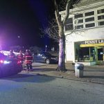 The four-door black sedan struck the side of a shop called Penny Lane. There is an apartment on its second floor.