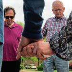 Pastor Richard Samuels of Cadogan Union Church joins hands with the Rev. Carmen Butler, pastor of New Kensington’s Allegheny Valley Church of God, as they pray outside the New Kensington municipal building during a National Day of Prayer service on Thursday, May 2, 2019. In the background, Karen Ecker of New Kensington was among the nine people who came together to pray.