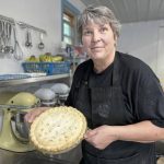 Dolly’s Diner head baker Pam Fouse with one of her homemade peach pies on opening day Monday in North Apollo.