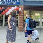 Dorseyville Middle School Program Principal Laura Miller greets a student-athlete Aug. 24 on the first day of school.
