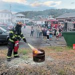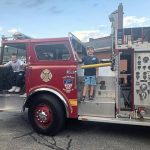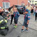 Freeport Fire Lt. Josh James talks about fire safety with Cub Scout Pack 557 den leader Lori Osche, her grandson Jonathan Osche, 8, and fellow Scout Jonny Pridgen, 8, all from Buffalo Township, while other touch-a-truck visitors look on Tuesday evening.