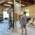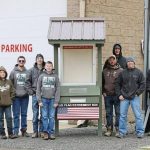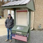 Boy Scouts (from left) Nathan Glass; Michael Duceour; Lukas Remaley; and his brother, Landon, stand next to the American flag disposal box and community message board. They are joined by family friends Ronnie Rollinger and Mark Williams; Lukas and Landon’s father, Ben Remaley; and their uncle, Clint Glass.