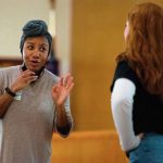 At the start of the class, she jumped down from the stage to talk with students. She worked one-on-one in front of the group with six students, who performed portions of their characters’ songs from “Newsies” and listened to them sing as a group.