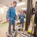 A large room holds other futuristic-looking equipment, including virtual reality goggles to challenge a patient’s balance and attention. Videos can simulate everyday functions, such as grocery shopping or laundry, which require patients to bend or reach.