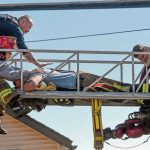 “Help was quickly summoned, and, after a well-coordinated rescue operation, the firefighter’s feet were freed from the rungs by removing his steel-toe firefighting boots and he was transported via ambulance to a local trauma center.”