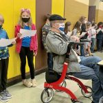 The song “On Veterans Day” by Karl Hitzemann was performed by youngsters, who lined the walls in the school’s cafeteria with hands over their hearts.