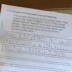 The paragraph reads, “The people decided to build a mighty tower. They called it the Tower of Babel. From it, they would defeat Yahweh. Yahweh came and confused the people. They could no longer understand one another. The people were spread to all the corners of the earth.”