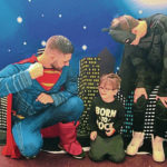 Superman (Zac Pulcini, a 2019 Valley High School graduate), and Batman (Anthony Salem, a junior at Valley) pose for a photo with Ethan Barrionuevo, 4, of Saxonburg.