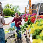 Julie Martin, of Allegheny Township, buys hanging basket flowers from Boy Scout Logan Watt of Boy Scout Troop 551 during a Mother’s Day flower sale on Saturday, May 6, 2023 at Leo’s Tire Service in Vandergrift.