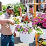Bill Watt, troop leader with Boy Scout Troop 551 of Allegheny Township, cleans off flower petals while his son, Logan, 15, hangs up new baskets during a Mother’s Day flower sale on Saturday, May 6, 2023 at Leo’s Tire Service in Vandergrift. Troop 551 and Troop 6551 of Allegheny Township are raising money for the Scouts’ summer camp trip. The sale will continue next Saturday, May 13, from noon to 5 p.m.