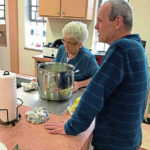 Volunteers Joan Huth and Ray Straughn help to cook items on the menu for the Freeport Area Meals on Wheels on Monday.