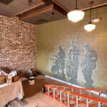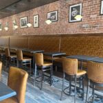 Exposed brick throughout was restored to its former glory, blending with a renovated dark tin ceiling and ample leather bench seating.