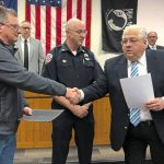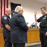 New Kensington Mayor Tom Guzzo (center) swears in police officer Christian Leonarski (right) as police Chief Bob Deringer looks on during a city council meeting on Monday, April 4. Leonarski was one of three new officers sworn in that night. Leonarski, Officer Jerry Hobeck and assistant fire Chief B.J. Kersey received commendations from the city for trying to save Angel Gray from a house fire on Fourth Avenue on March 6. Gray, 49, did not survive.