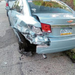 The car involved in the shooting, a Hyundai Elantra, hit the left rear of Geyer’s car. The impact pushed it forward and into the back of another car, crushing the front end.