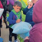 Jaleel Carter, 6, of East Ken Manor in New Kensington writes “love” and a heart on a balloon at a release in honor of his friend, Azuree Charles, 9, in front of where Azuree lived on Haser Drive on Thursday, Sept. 22, 2022. The balloon release was held the day after Azuree’s parents were charged in connection with his death in May.