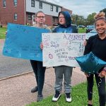 Aleese Olbeter (left), 15, and Tristan Olbeter, 12, (center) hold signs for 9-year-old Azuree Charles with Zariyah Carter, 11, during a balloon release for Azuree in East Ken Manor on Thursday, Sept. 22, 2022.