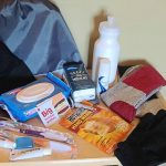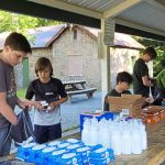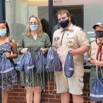 From left: Liam Alcorn-Ferry, Tyler Graham, Gabriel Manchini, Camden Seidel and Bill Seidel assemble care packages intended for homeless veterans at Memorial Park in New Kensington in June 2021. Nick Graham organized the effort for his Eagle Scout project.