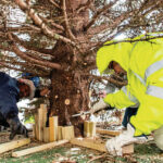 Crews cut down another tree on the former church’s property Thursday. Officials intend to use branches from that tree to help fill gaps in the main Christmas tree.
