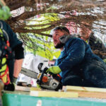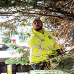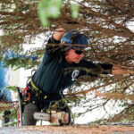 George DeSavage, with the City of Pittsburgh forestry department, uses a chainsaw to trim the bottom branches of the official City of Pittsburgh Christmas Tree on Saturday, Nov. 11, 2023 as crews worked on getting the tree straight and stable for the upcoming Light Up Night festivities on Grant Street at the City-County Building in downtown Pittsburgh.