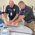 Plum School District police officers Joe Locke (left) and Jim Horwatt practice bleeding control at a Plum EMS class at the high school Aug. 17.