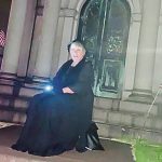 Sandy DeMento portrays the late Annie Wilson, who was burned to death 1925 after tossing paper into a furnace at her Wood Street home, during the Prospect Cemetery ghost tour in Brackenridge on Thursday.