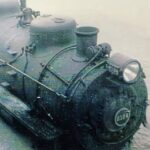 A freight engine is trapped by floodwaters in Creighton during the St. Patrick’s Day Flood of 1936.