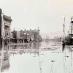 A photo taken from Corbet Street shows how high the water rose against the Fifth Avenue buildings (left) during the St. Patrick’s Day Flood of 1936.