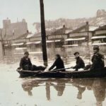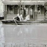 A man rows a boat through the streets of Brackenridge to help move residents to safety during the St. Patrick’s Day Flood of 1936.