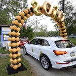 Students arrived at the drive-in with family members in decorated cars. A black and gold balloon arch was placed at the entrance to the lot, which was marked with designated parking spaces.