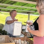 Myers Pickle Farm employee Sandy Hepler assists a customer Tuesday at the seasonal roadside produce stand along Route 66 in Gilpin.